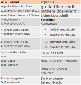 - Mit Wikitexten können Sie wie bei der Wikipedia einfache Formatierungen (z.B. Überschrift, Fettdruck, Aufzählung...) durch leicht merkbare Steuerzeichen realisieren. Eine einblendbare Tabelle bietet hierfür eine Gedächtnisstütze.