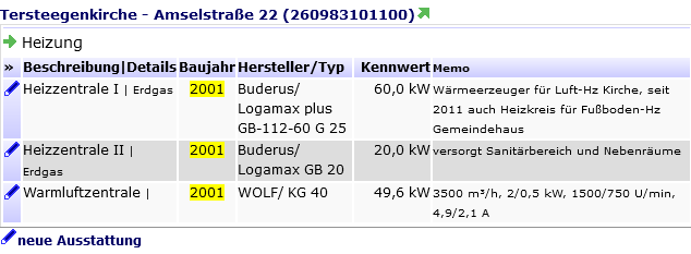 - Für technische Ausstattung, Gebäudehülle und Zusatznutzungen können Stichworte, Baujahr und Kennwerte erfasst werden.