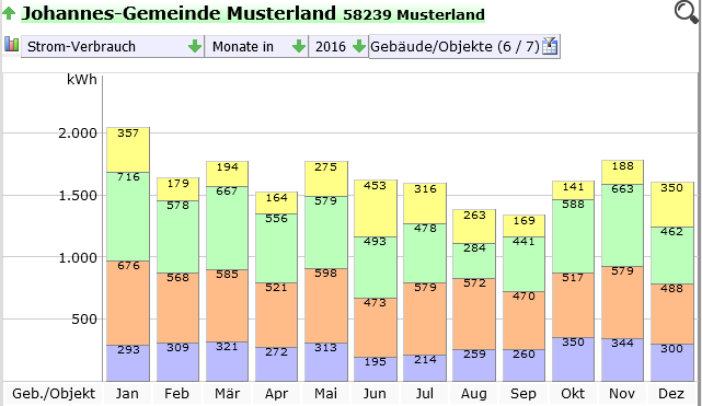 - Wird nur ein einziges Gebäude ausgewählt, werden neben dem ausgewählten Jahr noch die beiden Vorjahre angezeigt.