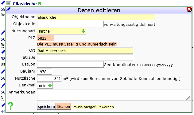 - Pflichtfelder wie die PLZ sind vor dem Speichern gelb unterlegt. Jedes nicht oder unplausibel ausgefüllte Pflichtfeld wird nach dem Speichern rosa markiert und ein Änderungshinweis wird eingeblendet.