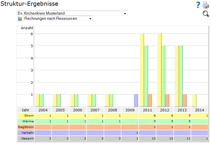 - Rechnungsdaten (und Bezugsdaten) sind die Grundlage von Kennzahlen-Tabelle und Bilanz-Diagrammen. Pro Sektor, Ressource und Verbrauchsjahr können Sie mehrere Rechnungen eingeben. Die Aufsummierung erfolgt nach dem Jahr des Feldes ´bis´.