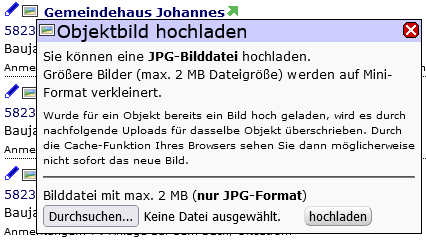 - Sie können Bilder (nur JPG-Format) von max. 2 MB Dateigröße hochladen. Die Bilder werden dann auf Mini-Format verkleinert.